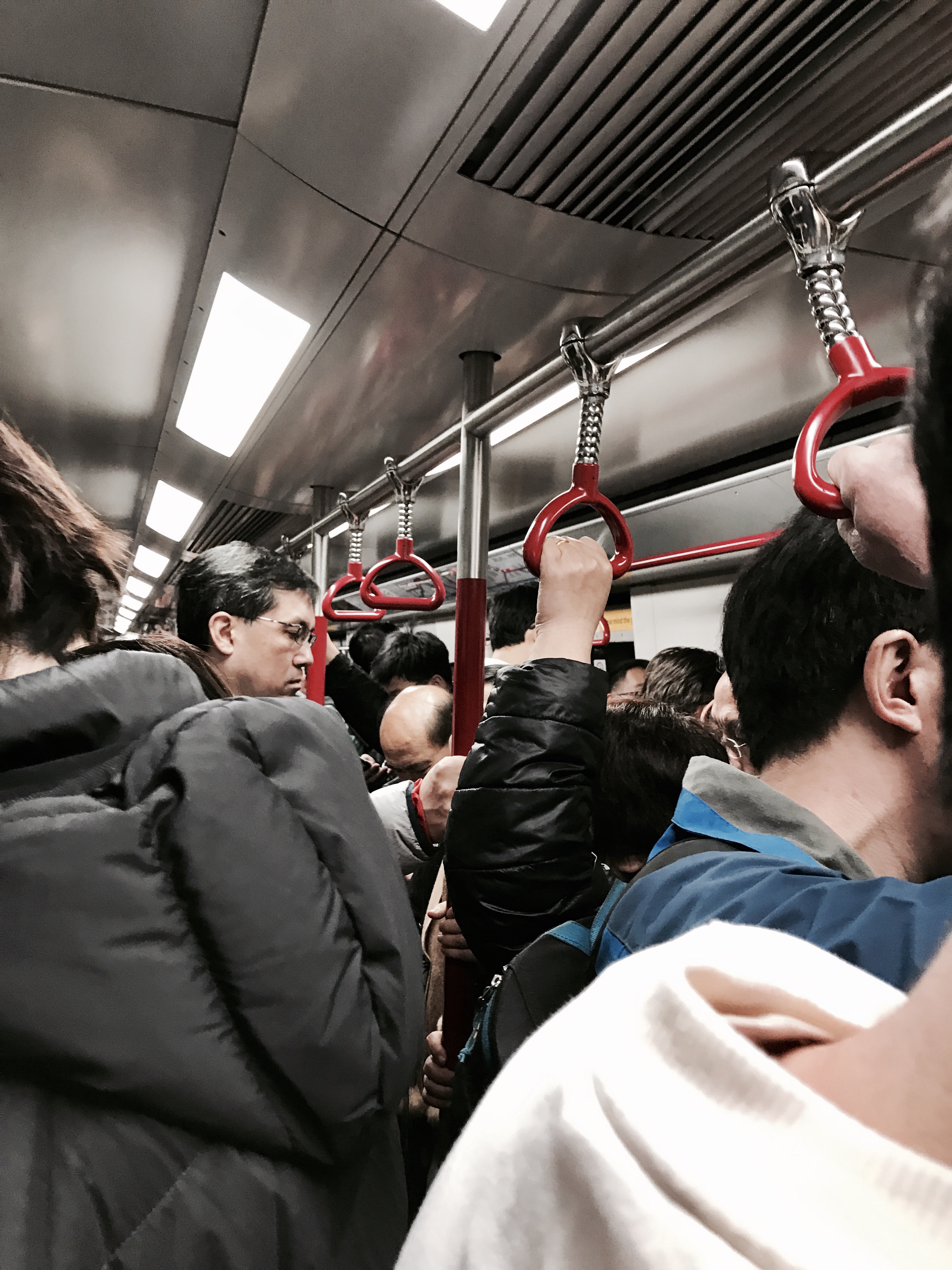 拿出八達通,嘟,入閘,直進,下樓梯,左右兩輛列車也停在月台,右邊的列車正要關門,於是我上了左邊的一輛列車。從列車的盡頭一直行,終於找到一個有空間的地方停下來站著,我前面的座位已經坐滿了人。下午7時多,放工時間,列車在中環總站已經進了很多人,幾分鐘後,列車從中環開出,駛到金鐘站,進了更多人,擠不進列車的人排滿月台,但奇怪地,列車久久不關上門,也沒有離開車站。我一直與姐姐what’s apps, 所以紀錄了時間。7時26分,車長廣播:「尖沙咀發生事故,本班車不停尖沙咀站。」車長語帶情緒,不是平常機械式的廣播。